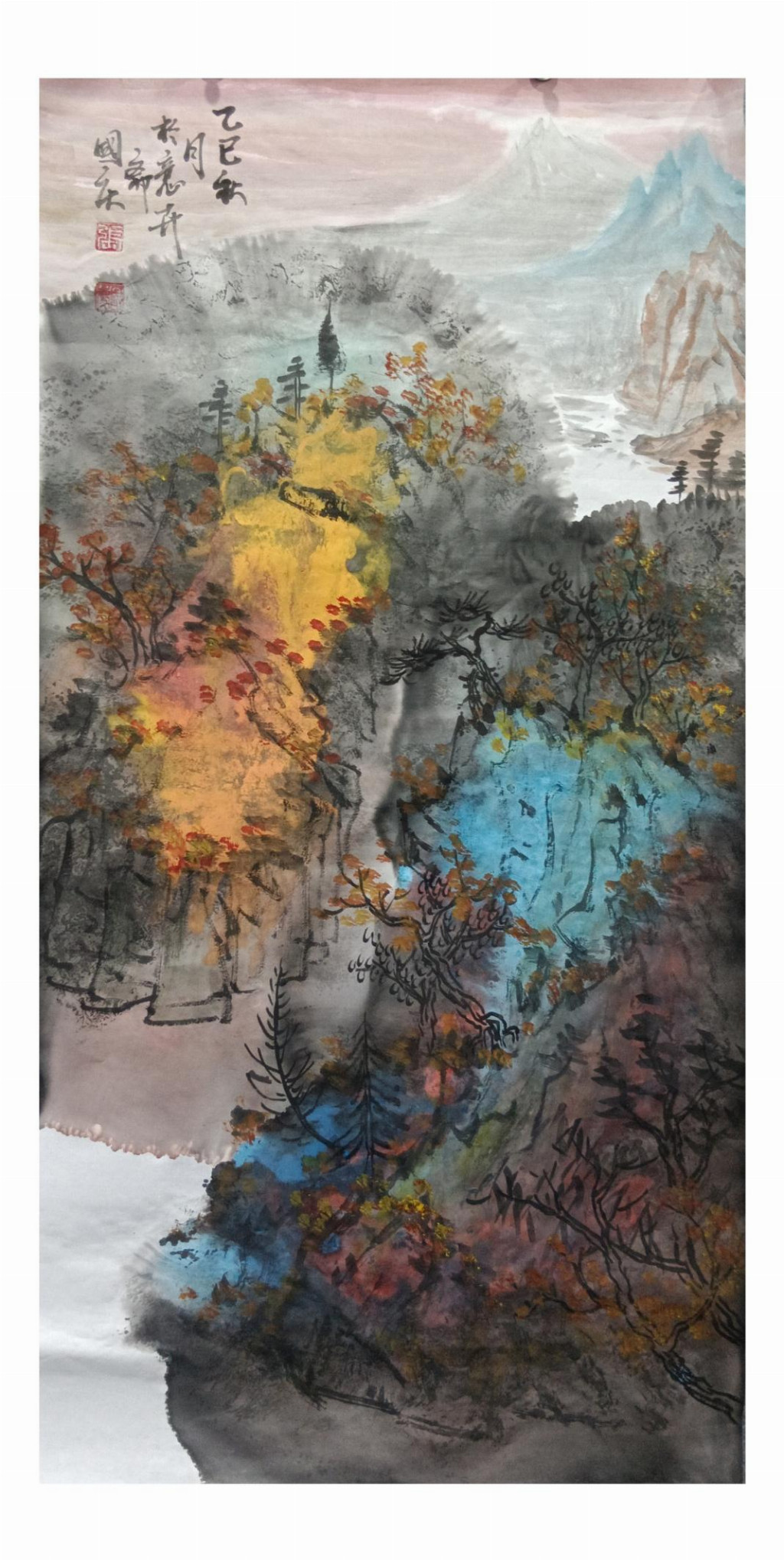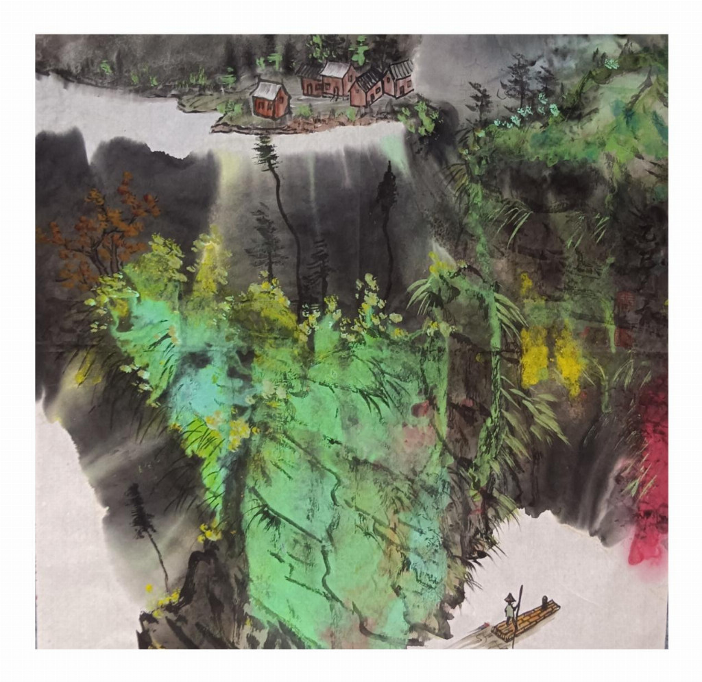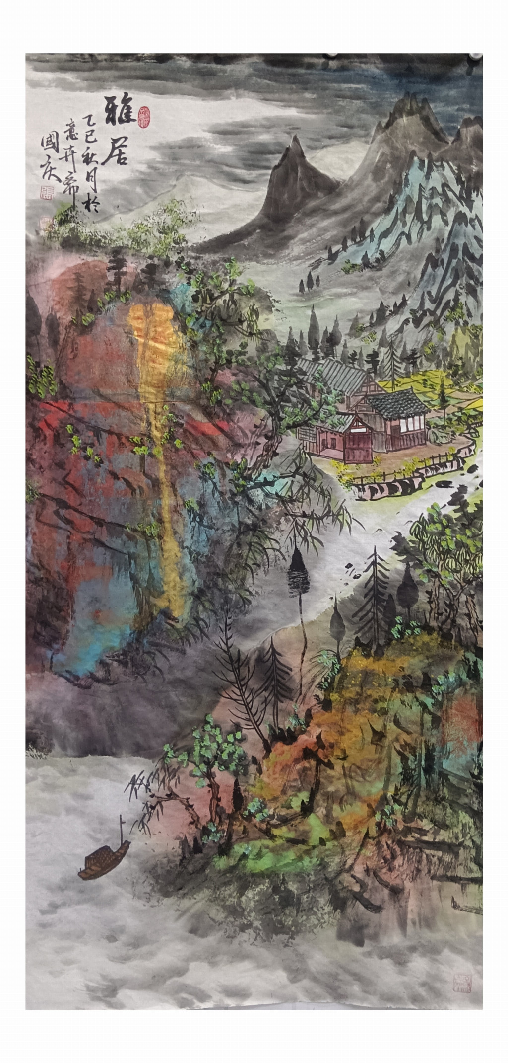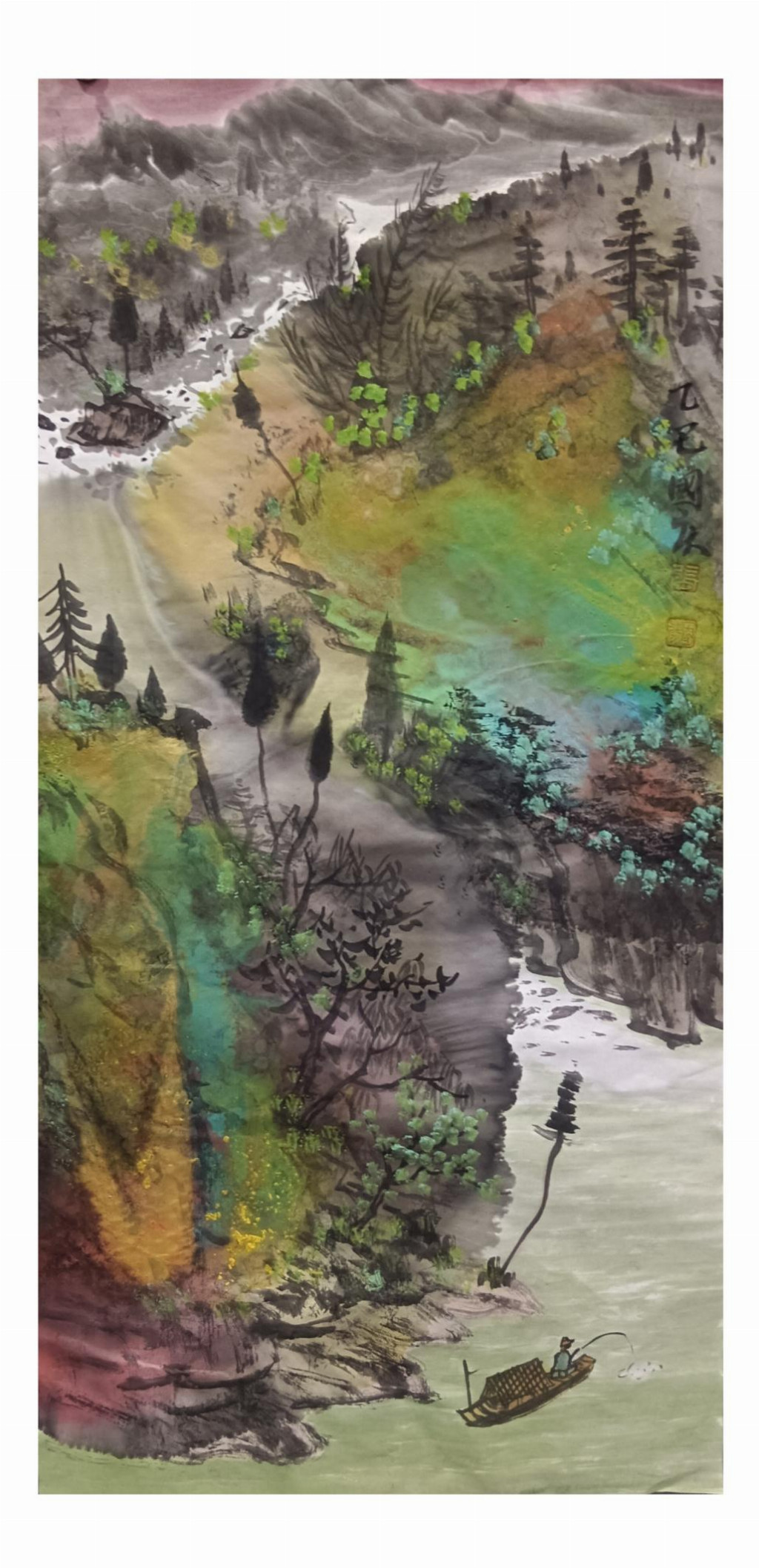 自然神韵的呈现:作品通过云雾、山峦、瀑布等元素展现自然风貌,运用泼彩法与积墨法营造出如梦如幻的意境。彩墨山水既保留传统山水韵味,又融入现代彩墨的创新性表达,形成“山色空蒙雨亦奇”的诗意画面。
