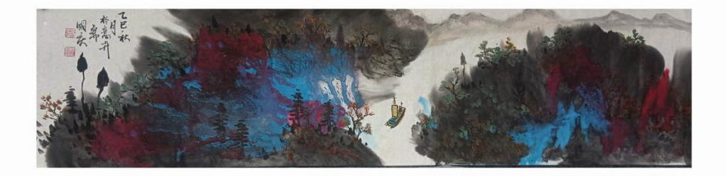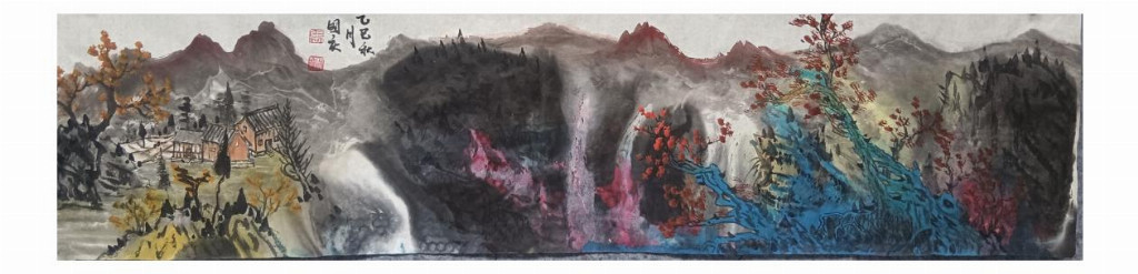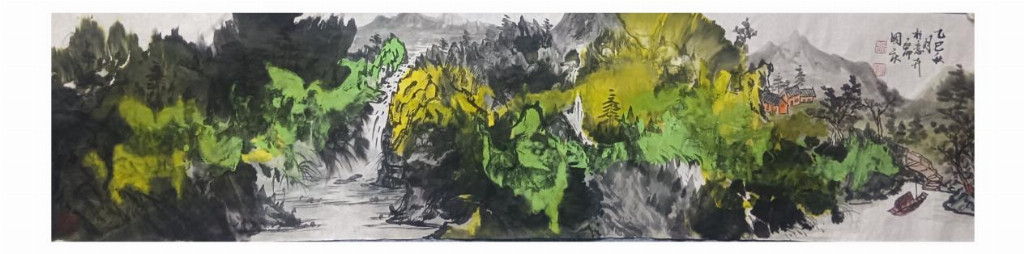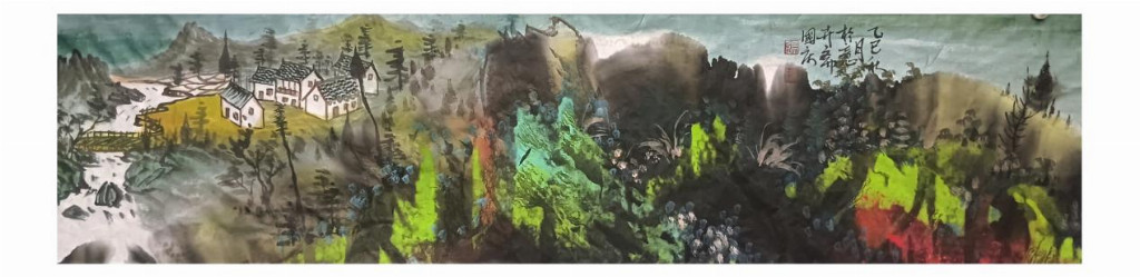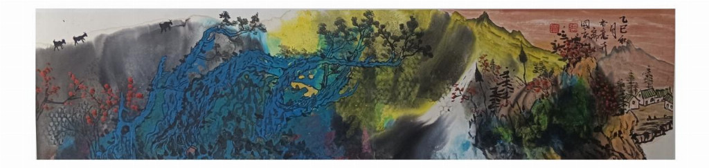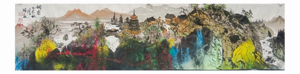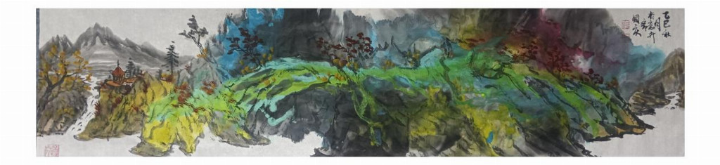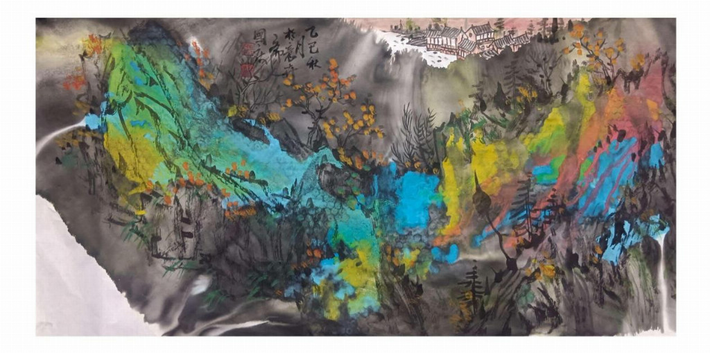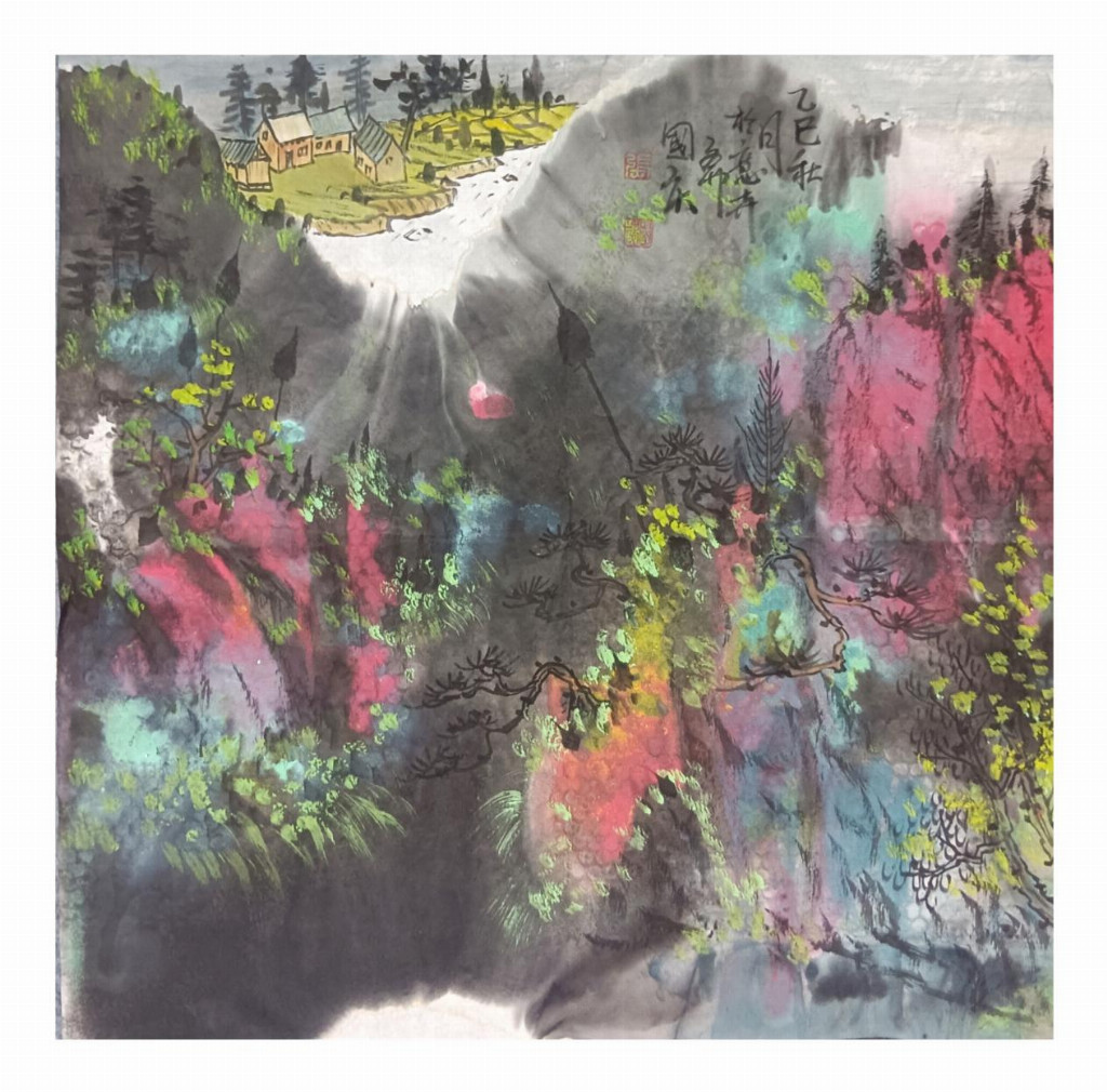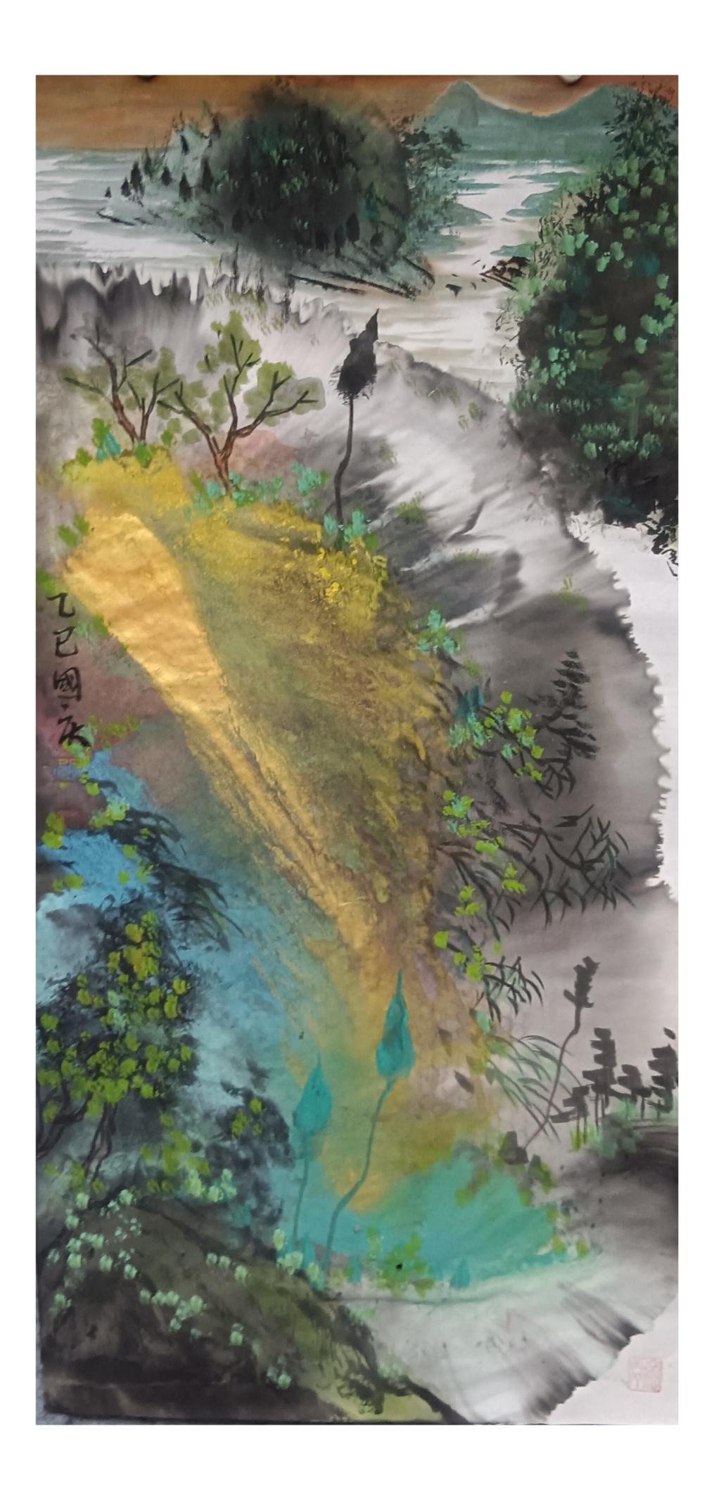 自然神韵的呈现:作品通过云雾、山峦、瀑布等元素展现自然风貌,运用泼彩法与积墨法营造出如梦如幻的意境。彩墨山水既保留传统山水韵味,又融入现代彩墨的创新性表达,形成“山色空蒙雨亦奇”的诗意画面。