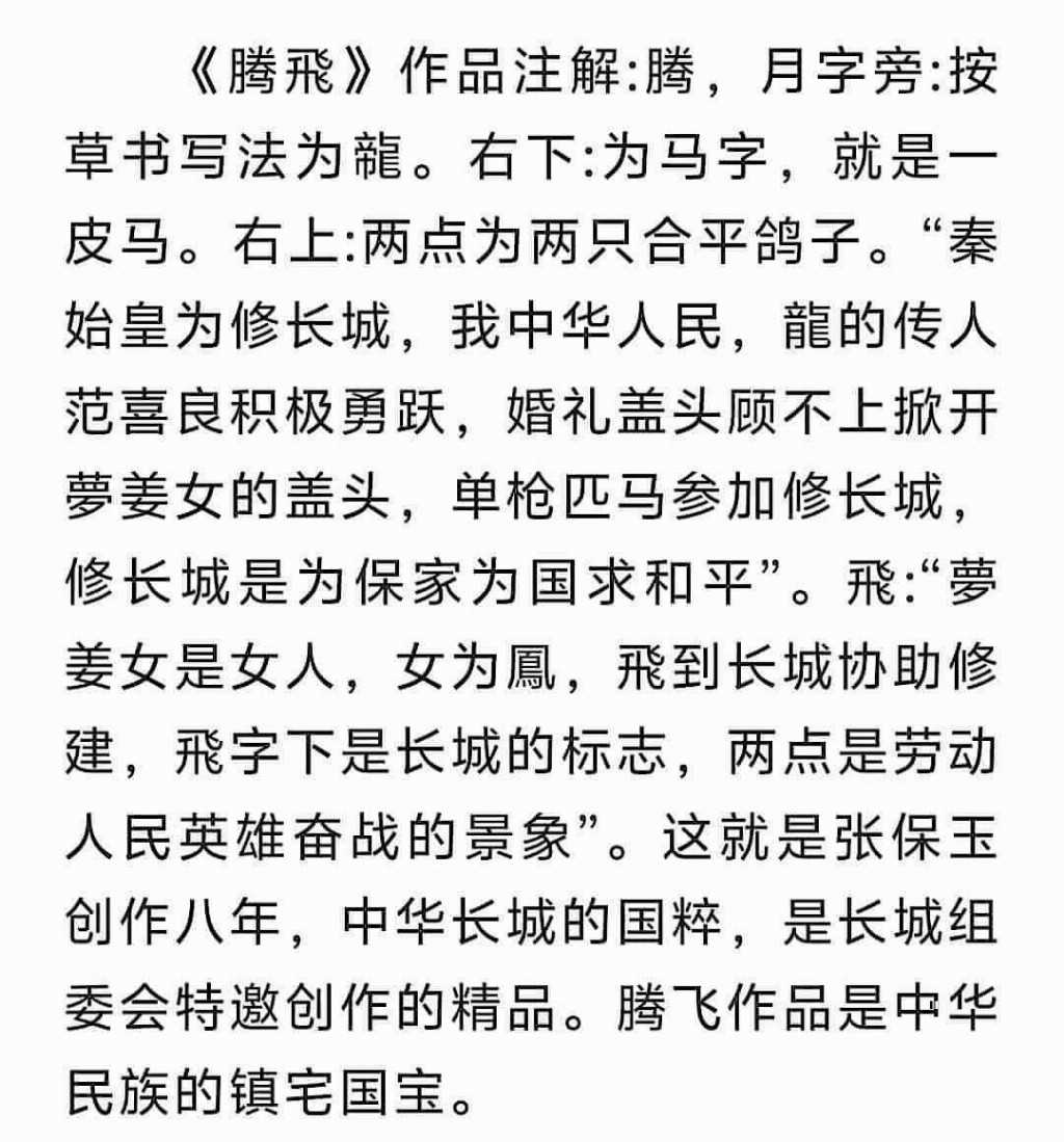 《腾飞》作为张宝玉最具代表性的作品之完美体现了"书画一体"的艺术理念。这一,5幅历时八年创作完成的精品,源于艺术家无数次到长城写生的经历与感悟。当看到毛泽东"不到长城非好汉"的题词时,张宝玉内心热血沸腾,决心用两个字表达中华民族的长城精神 。在《腾飞》中,"騰"字的"月"字旁被创作为一个草书笔顺的龙形,而"马"部则被画成一匹奔马,寓意"龙马精神";右上部两点化为两只和平鸽,象征着修长城追求的和平目的。"飛"字则以凤凰为首!孔雀为尾,两点代表劳动人民奋勇修长城的景象。整幅作品将书法与绘画、形式与内容历史与现实完美融合,被人民日报誉为“我国的镇宅国宝、是国粹”张宝玉的艺术创新得到了业界权威的高度认可。2005年9月,他的独创作品被中国文化部授予"开天辟地"光荣称号并出版发行。中国美术家协会主席刘大为对其作品评价道:"他在传承传统书法的基础上,另辟蹊径,根据'书画同源'之理,自出胸臆...他是中国当代书画翘楚,书画界未来的领军人物。"著名书画评论家罗成则认为:"世界艺坛大宗师张宝玉利用了前世未有的巧妙手法,弘扬了中华民族传统文化的特殊贡献书画一体的手法提醒了文化的重要性。他开辟了五千年的空白,开天辟地的篇章。