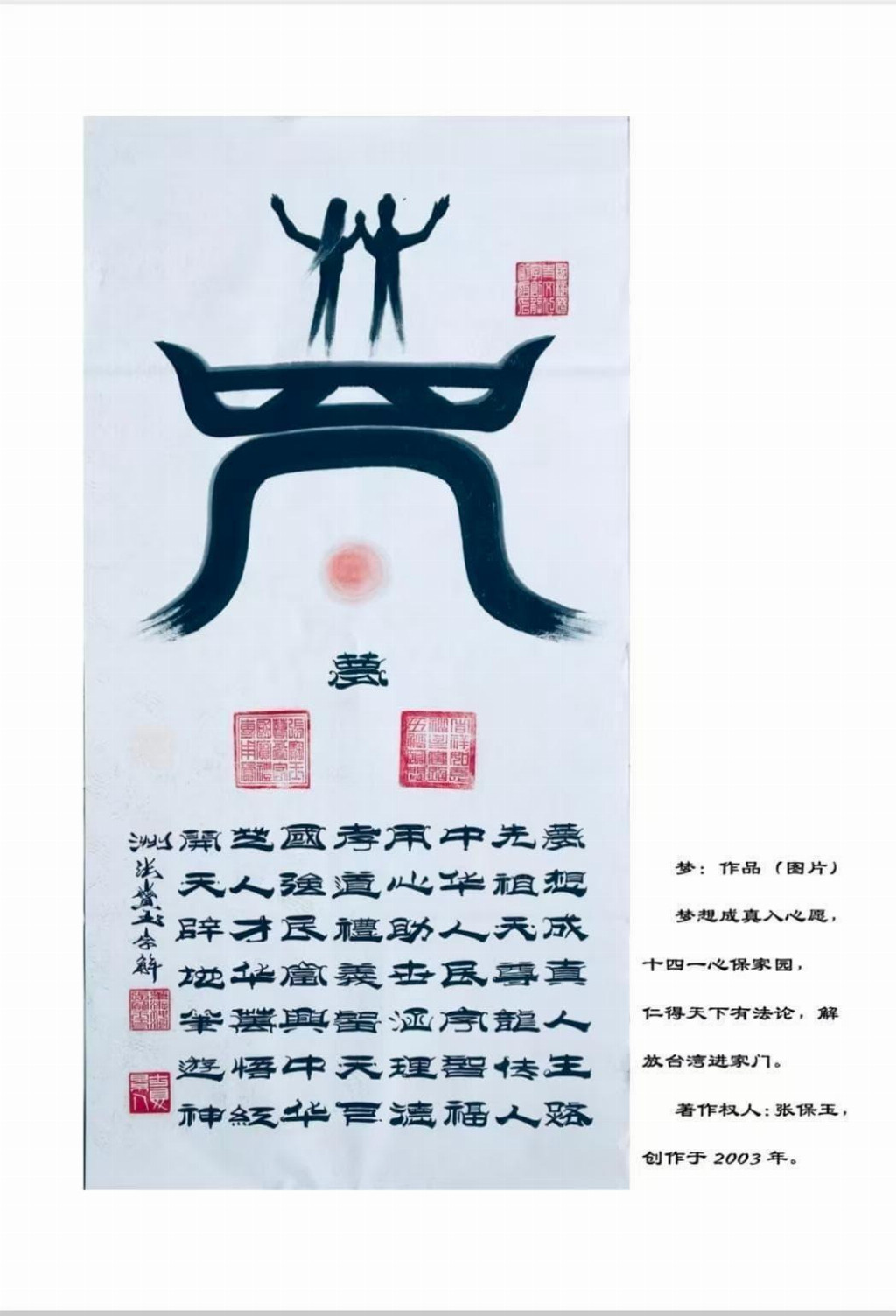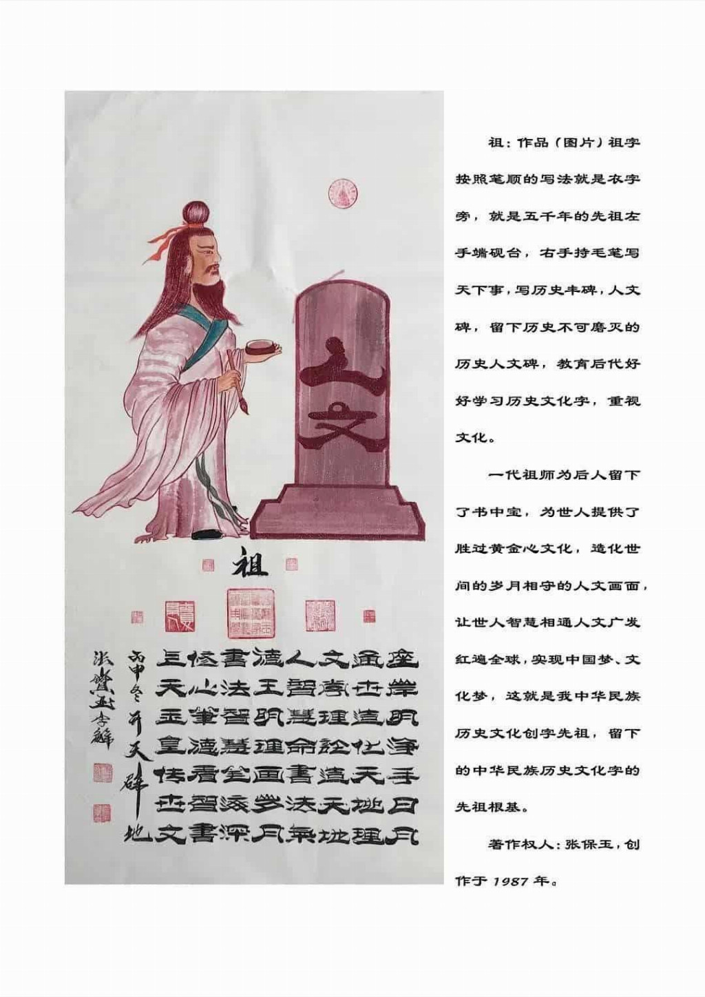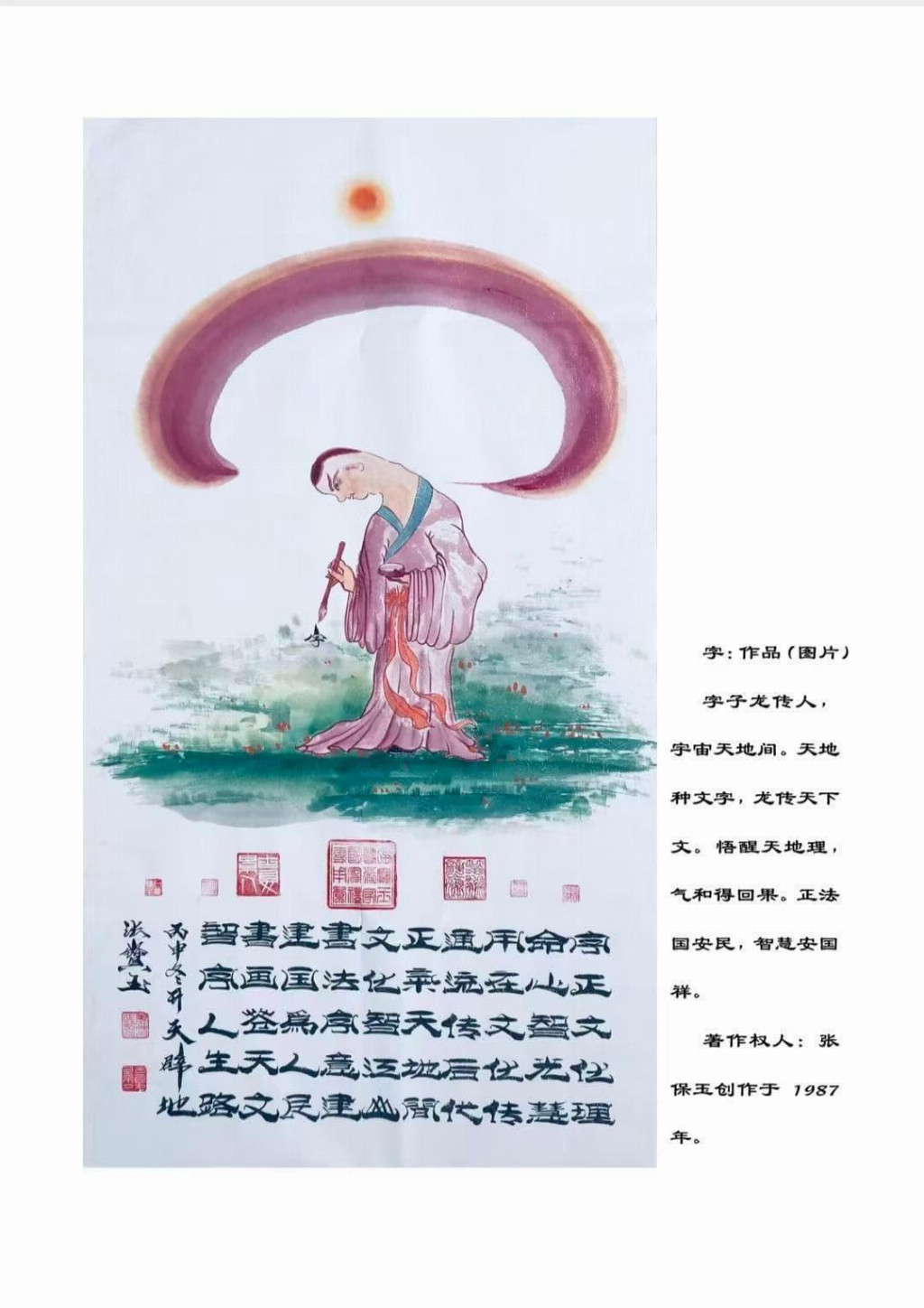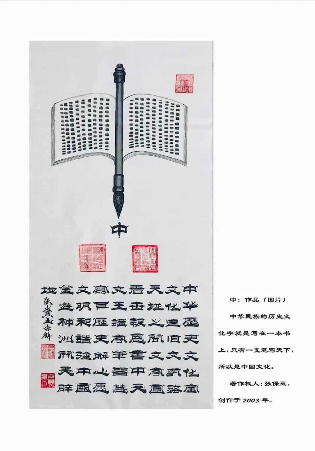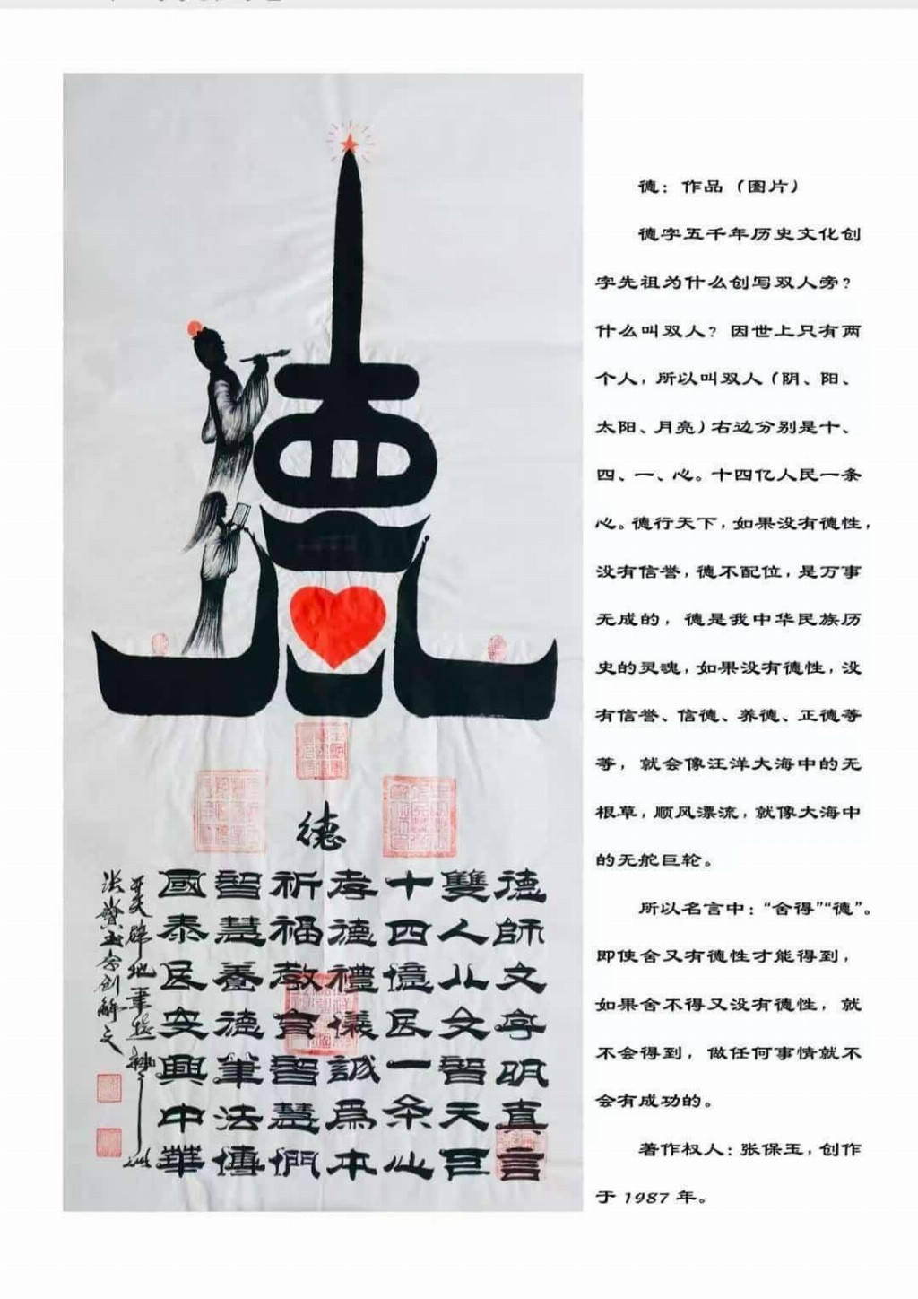 张宝玉的创作理念深深植根于中华传统文化的沃士,同时又饱含强烈的时代意识。他明确提出:"书画艺术是为时代服务,是这个时代发展的过度期和故事,是宣传这个时代的重要工具,是宣传这个时代的政治灵魂的助手,是这个时代的历史使命和见证。“这一理念表明,他将艺术创作视为记录时代、服务社会的重要方式,而非仅仅是个人情感的表达或技艺的展示。在艺术与文化传承的关系上,张宝玉有着深刻的认识和不懈的追求。他创建"国极历史文化字创解"的初衷就是为了弘扬中华民族传统文化美德,让下一代认识到文化的重要性。他曾在自述中谈到:"我把每个字按五干年前的创字先祖的创字意义画成一张画下边写成注解文章,主导思想是想教育和诱导下一代重视每一个字的重要性,好好学文化字。"这种将艺术创作与文化教育紧密结合的理念,体现了张宝玉作为艺术家的文化担当。