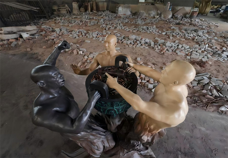 雕塑以“欧亚非三个人种争夺鼎”为核心形态。鼎,在中国古代便是权力的象征,是无数纷争的缘起;雕塑上半身,三人呈激烈争夺之势,肌肉紧绷、姿态焦灼,恰是人类为私欲兵戎相向的生动写照。而在这剑拔弩张的姿态之下,却是紧紧相连、盘根错节的树根——这是艺术家埋下的深刻隐喻:无论肤色、种族、地域,人类本就同根同源,命运休戚与共。