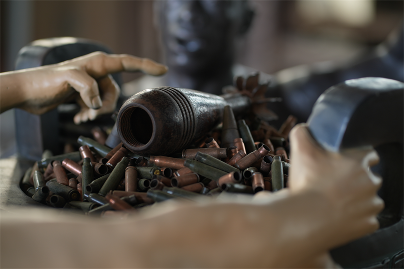 这件作品高150cm、宽143cm、深143cm,重达150kg的雕塑,以铜制、钢制子弹壳为核心材质熔铸而成。其创作灵感,源自三国时期曹植《七步诗》中“本自同根生,相煎何太急”的千古质问。黄初元年的储位之争,是同根相残的历史缩影;而放眼人类文明长河,从一战的堑壕到二战的焦土,从伊拉克的废墟到俄乌的战场,因权力私欲而起的纷争从未停歇。