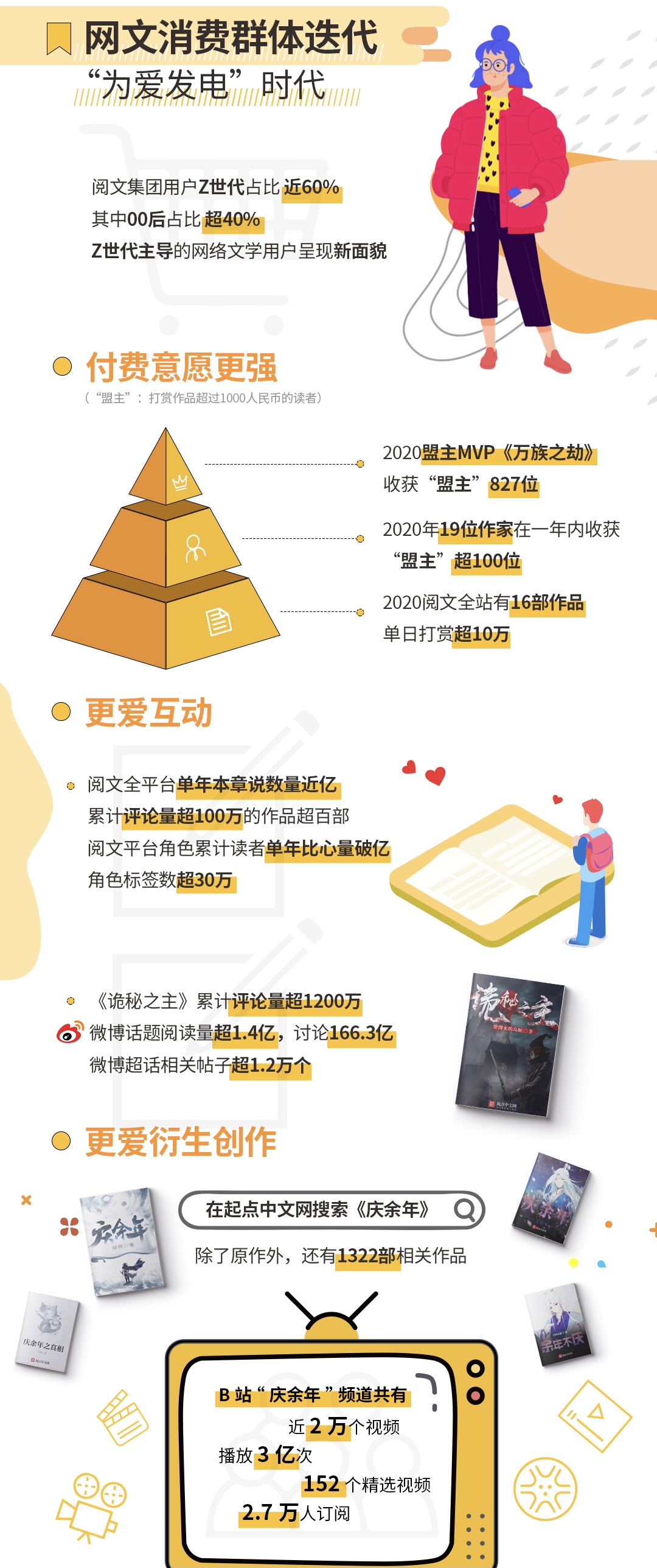 报告将“Z世代”定义为“95年以后出生的群体,包含‘95后’及‘00后’”。根据相关数据, 2020年阅文集团新增网文作家中,“Z世代”占比近八成,已成作家队伍新增主体。