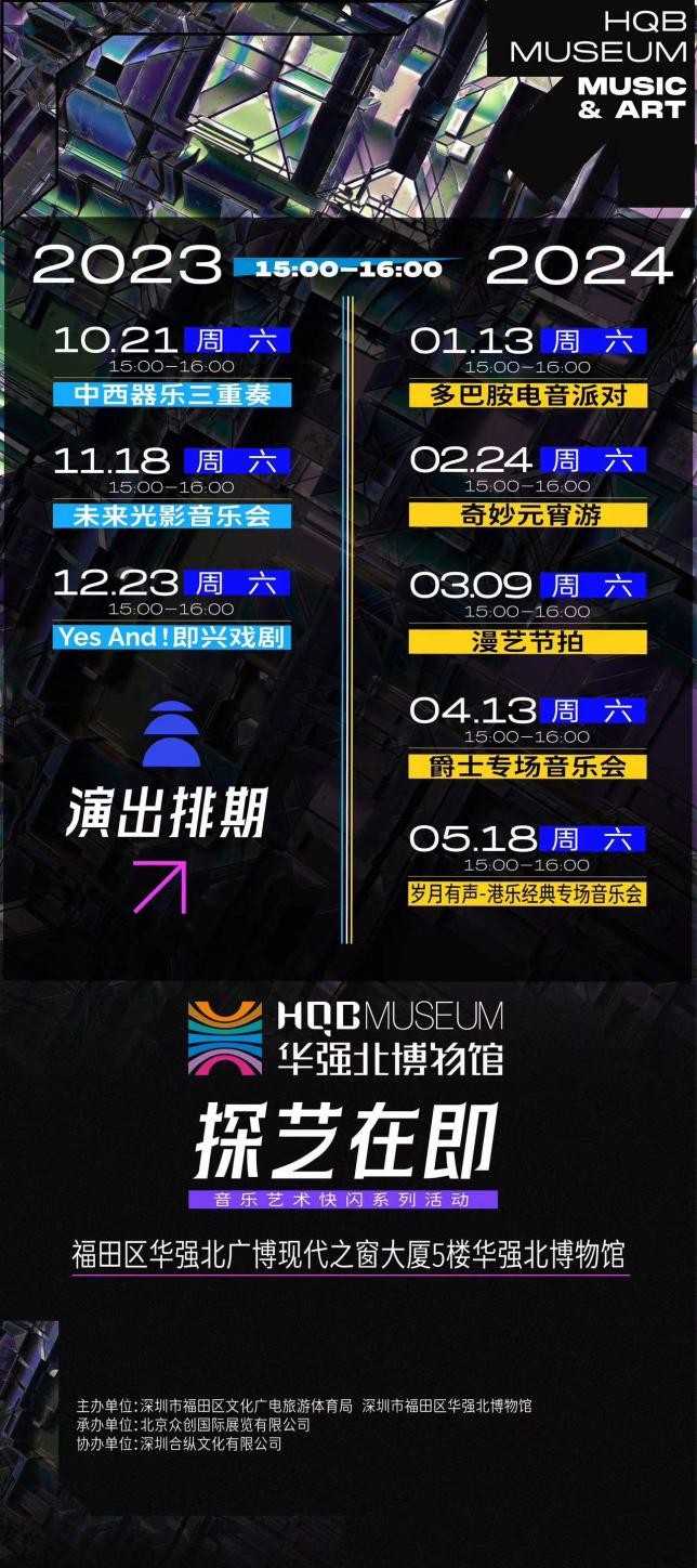 为助力全面推进“百千万工程”,响应福田文化强区铸魂行动,进一步助力福田打造新时代公共文化空间发展高地!华强北博物馆引进“探艺在即·音乐艺术快闪系列活动”。2023年已成功落地民乐、即兴戏剧、全息3D音乐会、电音派对等4场演出,呈现了华强北博物馆多样的新面貌!迈进新的一年,华强北博物馆再续新光彩,从奇妙元宵游的乐舞楼,到全员热烈互动的自然舞台再到浪漫小资的Jazz Club,全面挖掘了华强北博物馆隐藏的新身份,多变的身份让市民们惊呼:在华强北博物馆看到多元的艺术和科技结伴而行,超级惊喜!