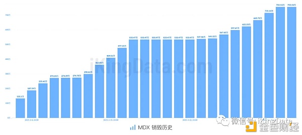 MDX 总量约为 10亿,MDEX 会使用平台收入的 66% 中的 30% 进入回购资金池,当 MDX 触发回购价格时(回购价格为 MDX 72小时平均价),进行销毁。当前 MDX 累计销毁768万枚,剩余流通总量1.06亿枚。