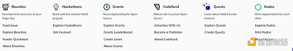 Gitcoin目前主要有五个产品:Bounties(悬赏)、Hackathons(黑客马拉松)、Grants(资助)、Codefund(代码基金)、Quests(任务)和Kudos。