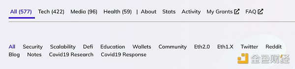 Gitcoin Grants主要资助公共品,比如开源软件(Open Source Software)、新闻媒体(Media)、公共健康(PHealth)等包含在内。