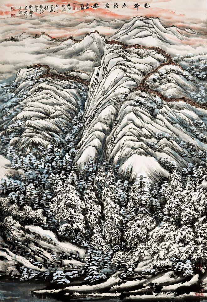 马忠田用笔精练老到,用墨熟练,这幅长征颂,他采取了顶天立地满构图的方式,但满而不堵,很有气势,正好表现了红军长征大无畏的革命精神。