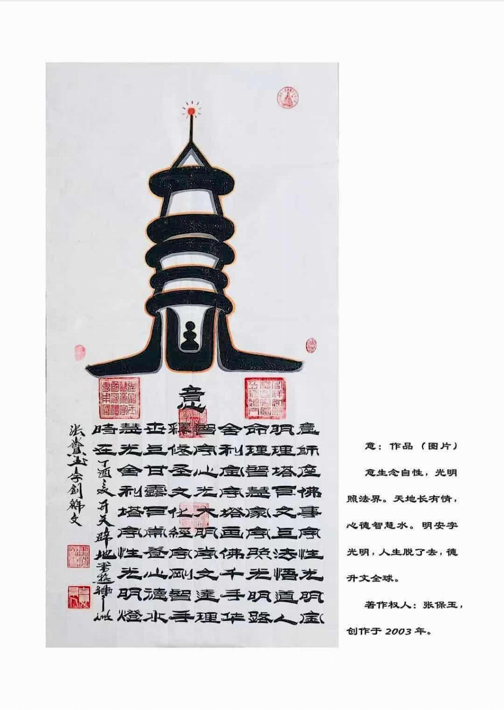 张宝玉的创作理念深深植根于中华传统文化的沃士,同时又饱含强烈的时代意识。他明确提出:"书画艺术是为时代服务,是这个时代发展的过度期和故事,是宣传这个时代的重要工具,是宣传这个时代的政治灵魂的助手,是这个时代的历史使命和见证。“这一理念表明,他将艺术创作视为记录时代、服务社会的重要方式,而非仅仅是个人情感的表达或技艺的展示。在艺术与文化传承的关系上,张宝玉有着深刻的认识和不懈的追求。他创建"国极历史文化字创解"的初衷就是为了弘扬中华民族传统文化美德,让下一代认识到文化的重要性。他曾在自述中谈到:"我把每个字按五干年前的创字先祖的创字意义画成一张画下边写成注解文章,主导思想是想教育和诱导下一代重视每一个字的重要性,好好学文化字。"这种将艺术创作与文化教育紧密结合的理念,体现了张宝玉作为艺术家的文化担当。