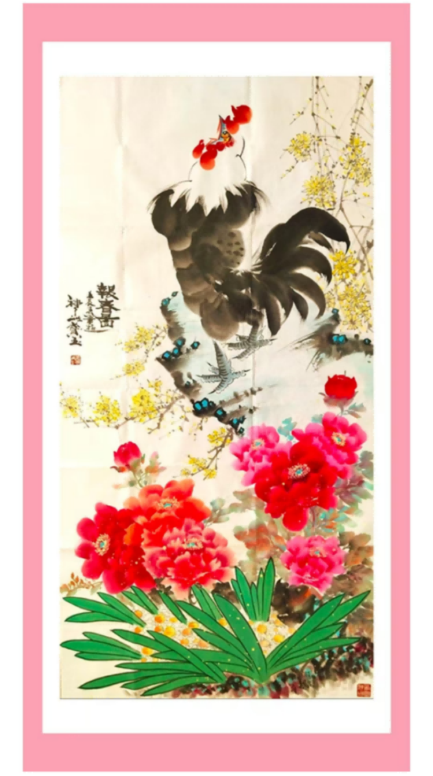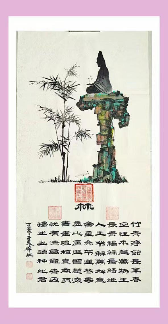 书画一体的革命性突破不同于传统意义上的“画中有书,书中有画",张宝玉的"书画一体体"是一种更为本质和深刻的艺术融合。在他的创作中,书画不再是简单的结合或并置而是达到了“画是书、书是画"的完全融合境界 。具体而言,张宝玉将彩、墨、文、图印、意通融一体,使一幅作品能够全面展现中国传统文化的多重意境。这种独创的艺术形式,被评论家誉为"泱泱干年忽现才俊的艺术大成",填补了中国五干年艺术史上的一项空白。