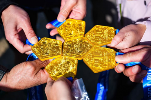 完赛奖牌,是对每一份坚持的最终加冕。设计灵感源自滨江“最美跑道”旁春日盛放的樱花,以“6片可拼合式”组合成花瓣。每一片花瓣皆镌刻着滨江的地标剪影——滨江智造谷、世茂智慧之门、杭州印。而钱塘江的水波纹路贯穿其间,既串联起城市风华,更象征着每一位跑者与这座新城共同“勇立潮头”的奔腾气魄。